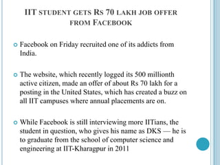 1. Facebook recruited an IIT student from India offering a salary of Rs. 70 lakh for a position in the United States, creating a buzz on IIT campuses.