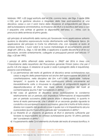La sentenza n. 29627 del 2016 della Corte di Cassazione ha affrontato aspetti riguardanti la gestione delle discariche e la omessa bonifica, specificando che il reato di gestione non autorizzata persiste anche nella fase post-operativa. Inoltre, la responsabilità per la bonifica si estende agli amministratori subentranti e a terzi coinvolti, mentre la compilazione di documenti falsi non integra il reato di falsità ideologica. Infine, si sottolinea l'importanza di adeguarsi alle normative europee relative alle infrastrutture per la ricarica di auto elettriche.