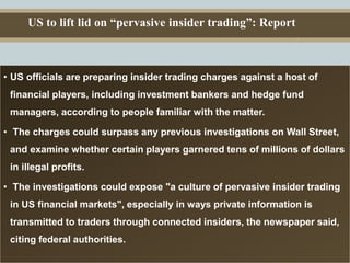 US officials are preparing insider trading charges against numerous financial players such as investment bankers and hedge fund managers. The charges could expose a culture of pervasive insider trading in US financial markets through connected insiders transmitting private information to traders. Wells Fargo will pay Citigroup $100 million to settle lawsuits over Wells Fargo's 2008 purchase of Wachovia. China will increase grain supplies and open more land for vegetable crops to combat rising inflation caused by flooding and cold weather damaging crops. China is emerging as a competitor in the international arms trade by offering increasingly sophisticated weapons that are beginning to rival other major exporters like Russia.