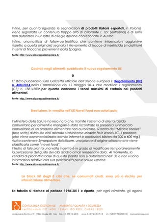 Il documento riporta vari allarmi alimentari in Italia, tra cui eccessi di mercurio in pesci e contaminazioni da listeria, agendo come un sistema di allerta rapido per assicurare la sicurezza alimentare. Sono anche menzionati respingimenti alla frontiera per alimenti contaminati e informazioni su prodotti esportati con residui non conformi. Infine, vengono discussi i regolamenti europei riguardanti i limiti massimi di residui di pesticidi negli alimenti e le sfide nell'applicazione di tali normative.