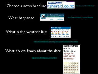 This document outlines learning intentions and success criteria for oral language skills. The goals are to form and express ideas clearly using eye contact, expressive speech, clear articulation, appropriate volume, and a wider vocabulary. Maintaining audience attention is also a focus. Specific oral language activities are listed such as class news, instructions, interviews, and reporting to help meet these criteria. Online resources are provided for content related to current events, weather, dates, and vocabulary.