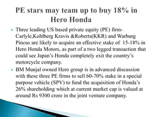 Three major US private equity firms (Carlyle, Kohlberg Kravis & Roberts, and Warburg Pincus) are in discussions to acquire a 15-18% stake in Hero Honda Motors as part of a transaction where Honda would exit their 26% joint venture stake. The Hero group would sell a 60-70% stake in a special purpose vehicle to the private equity firms to fund the acquisition of Honda's 9,300 crore rupee stake. Coal India's IPO drew enough bids for $58 billion, indicating investor appetite for shares if reasonably priced. The IPO makes Coal India one of the largest listed coal producers globally. BNP Paribas has established an India Advisory Board to provide