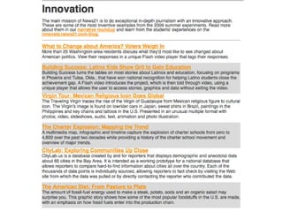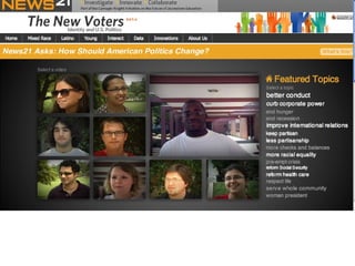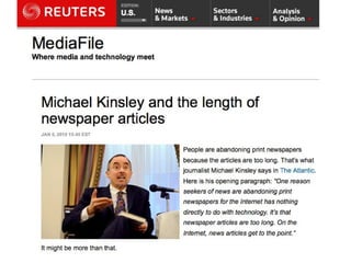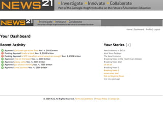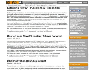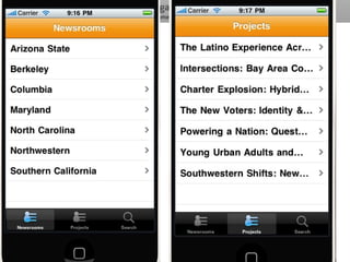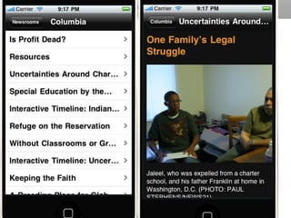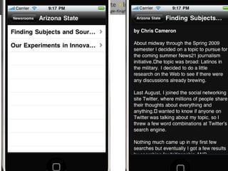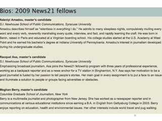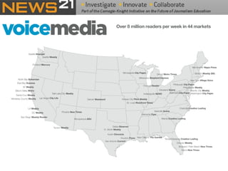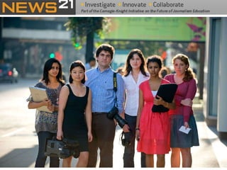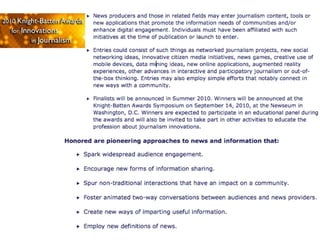 The document outlines the changing landscape of journalism in America, emphasizing the need for in-depth, innovative reporting that pushes boundaries across various platforms. It discusses the establishment of incubators in journalism schools to enhance curricula and improve media relationships, alongside the integration of new storytelling techniques and multimedia innovations. The document also highlights challenges faced by publishers in adapting to new content delivery methods and the growing importance of social media in outreach strategies.
