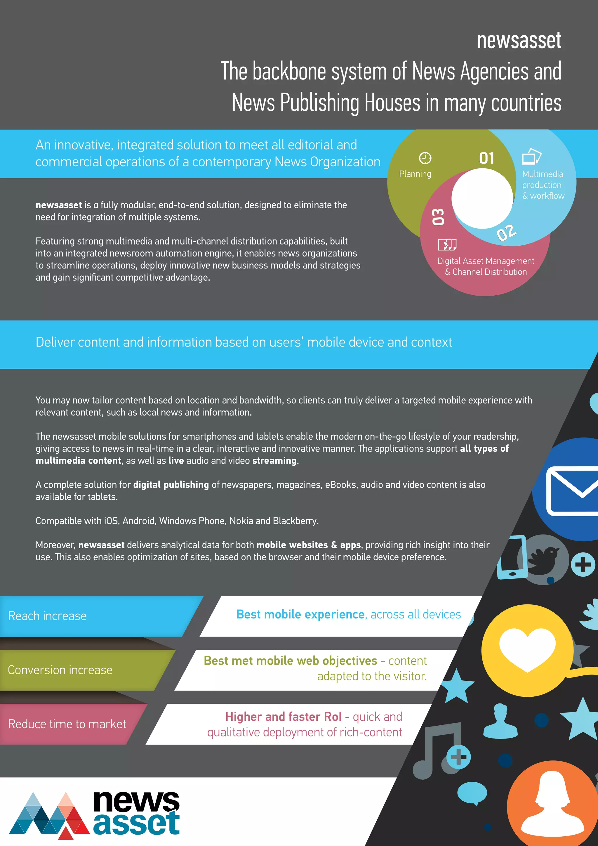 newsasset is an integrated digital asset management and news distribution solution that streamlines operations for news organizations. It provides a single system for editorial and commercial workflows, including planning, production, distribution to multiple channels, and analytics. The solution supports all types of content across devices with mobile apps that deliver localized news and information based on a user's location and bandwidth. newsasset aims to help media companies gain competitive advantages through more efficient operations and the ability to innovate new business models and strategies.