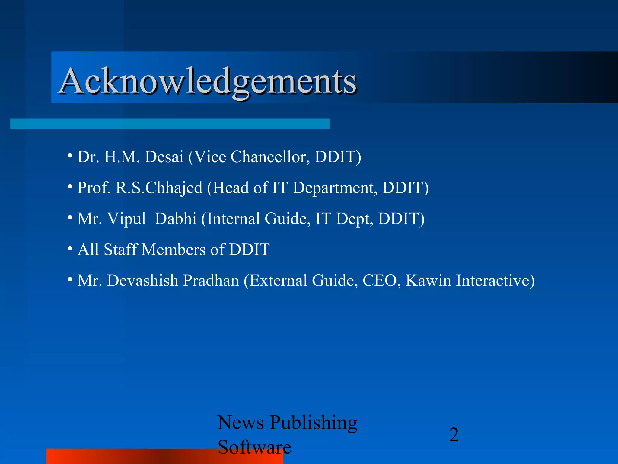 This document provides an overview of a news publishing software system. It acknowledges contributions from various individuals and organizations. It then outlines the goals, concept, features, hardware/software requirements, system design including modules and screen layouts. The software allows administrators, editors and reporters to manage news categories, add/delete/modify news content, and schedule publishing of news articles through a web-based interface. It provides functionality like searching, previewing, and printing news. The presentation concludes by stating that further implementation work remains to fully achieve the project goals.