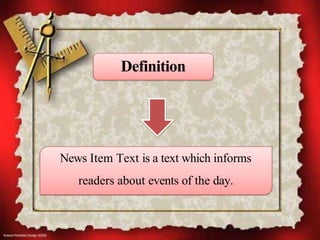This document defines and provides the generic structure of a news item text. A news item text informs readers about the important events of the day. It typically includes a newsworthy event as the main topic, background details on the event including its location and time, and sources or expert comments on the event. The document also provides an example news item text reporting on a collision that killed seven people on Jalan Sultan, with background on the accident and comments from the police.