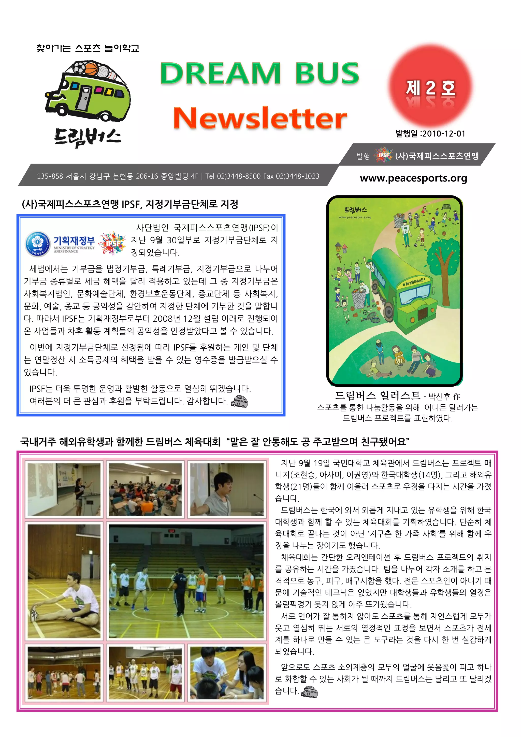 ๋ฐํ์ผ :2010-12-01 ๋ฐํ (์ฌ)๊ตญ์ ํผ์ค์คํฌ์ธ ์ฐ๋งน 135-858 ์์ธ์ ๊ฐ๋จ๊ตฌ ๋ ผํ๋ 206-16 ์ค์๋น๋ฉ 4F๏ฝTel 02)3448-8500 Fax 02)3448-1023 www.peacesports.org (์ฌ)๊ตญ์ ํผ์ค์คํฌ์ธ ์ฐ๋งน IPSF, ์ง์ ๊ธฐ๋ถ๊ธ๋จ์ฒด๋ก ์ง์ ์ฌ๋จ๋ฒ์ถ ๊ตญ์ ํผ์ค์คํฌ์ธ ์ฐ๋งน(IPSF)์ด ์ง๋ 9์ 30์ท๋ถ๋ก ์ง์ ๊ธฐ๋ถ๊ธ๋จ์ฒด๋ก ์ง ์ ๋์์ต๋๋ค. ์ธ๋ฒ์์๋ ๊ธฐ๋ถ๊ธ์ ๋ฒ์ ๊ธฐ๋ถ๊ธ, ํน๋ก๊ธฐ๋ถ๊ธ, ์ง์ ๊ธฐ๋ถ๊ธ์ผ๋ก ๋๋์ด ๊ธฐ๋ถ๊ธ ์ข ๋ฅ๋ณ๋ก ์ธ๊ธ ํํ์ ๋ฌ๋ฆฌ ์ ์ฉํ๊ณ ์๋๋ฐ ๊ทธ ์ค ์ง์ ๊ธฐ๋ถ๊ธ์ ์ฌํ๋ณต์ง๋ฒ์ถ, ๋ฌธํ์์ ๋จ์ฒด, ํ๊ฒฝ๋ณดํธ์ฒ๋๋จ์ฒด, ์ข ๊ต๋จ์ฒด ๋ฑ ์ฌํ๋ณต์ง, ๋ฌธํ, ์์ , ์ข ๊ต ๋ฑ ๊ณต์ต์ฑ์ ๊ฐ์ํ์ฌ ์ง์ ํ ๋จ์ฒด์ ๊ธฐ๋ถํ ๊ฒ์ ๋งํฉ๋ ๋ค. ๋ฐ๋ผ์ IPSF๋ ๊ธฐํ์ฌ์ ๋ถ๋ก๋ถํฐ 2008๋ 12์ ์ค๋ฆฝ ์ด๋๋ก ์งํ๋์ด ์จ ์ฌ์ ๋ ๊ณผ ์ฐจํ ํ๋ ๊ณํ๋ ์ ๊ณต์ต์ฑ์ ์ถ์ ๋ฐ์๋ค๊ณ ๋ณผ ์ ์์ต๋๋ค. ์ด๋ฒ์ ์ง์ ๊ธฐ๋ถ๊ธ๋จ์ฒด๋ก ์ ์ ๋จ์ ๋ฐ๋ผ IPSF๋ฅผ ํ์ํ๋ ๊ฐ์ถ ๋ฐ ๋จ์ฒด ๋ ์ฐ๋ง์ ์ฐ ์ ์๋๊ณต์ ์ ํํ์ ๋ฐ์ ์ ์๋ ์์์ฆ์ ๋ฐ๊ธ๋ฐ์ผ์ค ์ ์์ต๋๋ค. IPSF๋ ๋์ฑ ํฌ๋ช ํ ์ฒ์๊ณผ ํ๋ฐํ ํ๋์ผ๋ก ์ด์ฌํ ๋ฐ๊ฒ ์ต๋๋ค. ์ฌ๋ฌ๋ถ์ ๋ ํฐ ๊ด์ฌ๊ณผ ํ์์ ๋ถํ๋๋ฆฝ๋๋ค. ๊ฐ์ฌํฉ๋๋ค. ๋๋ฆผ๋ฒ์ค ์ผ๋ฌ์คํธ - ๋ฐ์ํ ไฝ ์คํฌ์ธ ๋ฅผ ํตํ ๋๋ํ๋์ ์ํด ์ด๋๋ ๋ฌ๋ ค๊ฐ๋ ๋๋ฆผ๋ฒ์ค ํ๋ก์ ํธ๋ฅผ ํํํ์๋ค. ๊ตญ๋ด๊ฑฐ์ฃผ ํด์ธ์ ํ์๊ณผ ํจ๊ปํ ๋๋ฆผ๋ฒ์ค ์ฒด์ก๋ํ โ๋ง์ ์ ์ํตํด๋ ๊ณต ์ฃผ๊ณ ๋ฐ์ผ๋ฉฐ ์น๊ตฌ๋์ด์โ ์ง๋ 9์ 19์ท ๊ตญ๋ฏผ๋ํ๊ต ์ฒด์ก๊ด์์ ๋๋ฆผ๋ฒ์ค๋ ํ๋ก์ ํธ ๋งค ๋์ (์กฐํ์น, ์์ฌ๋ฏธ, ์ด๊ถ์)์ ํ๊ตญ๋ํ์(14๋ช ), ๊ทธ๋ฆฌ๊ณ ํด์ธ์ ํ์(21๋ช )๋ ์ด ํจ๊ป ์ด์ณ๋ ค ์คํฌ์ธ ๋ก ์ฐ์ ์ ๋ค์ง๋ ์๊ฐ์ ๊ฐ์ก ์ต๋๋ค. ๋๋ฆผ๋ฒ์ค๋ ํ๊ตญ์ ์์ ์ธ๋กญ๊ฒ ์ง๋ด๊ณ ์๋ ์ ํ์์ ์ํด ํ๊ตญ ๋ํ์๊ณผ ํจ๊ป ํ ์ ์๋ ์ฒด์ก๋ํ๋ฅผ ๊ธฐํํ์์ต๋๋ค. ๋จ์ํ ์ฒด ์ก๋ํ๋ก ๋๋๋ ๊ฒ์ด ์๋ โ์ง๊ตฌ์ด ํ ๊ฐ์กฑ ์ฌํโ๋ฅผ ์ํด ํจ๊ป ์ฐ ์ ์ ๋๋๋ ์ฅ์ด๊ธฐ๋ ํ์ต๋๋ค. ์ฒด์ก๋ํ๋ ๊ฐ๋จํ ์ค๋ฆฌ์ํ ์ด์ ํ ๋๋ฆผ๋ฒ์ค ํ๋ก์ ํธ์ ์ทจ์ง ๋ฅผ ๊ณต์ ํ๋ ์๊ฐ์ ๊ฐ์ก์ต๋๋ค. ํ์ ๋๋์ด ๊ฐ์ ์๊ฐ๋ฅผ ํ๊ณ ๋ณธ ๊ฒฉ์ ์ผ๋ก ๋๊ตฌ, ํผ๊ตฌ, ๋ฐฐ๊ตฌ์ํฉ์ ํ๋ค. ์ ๋ฌธ ์คํฌ์ธ ์ถ์ด ์๋๊ธฐ ๋ ๋ฌธ์ ๊ธฐ์ ์ ์ถ ํ ํฌ๋์ ์์์ง๋ง ๋ํ์๋ ๊ณผ ์ ํ์๋ ์ ์ด์ ์ ์ฌ๋ฆผํฝ๊ฒฝ๊ธฐ ๋ชป์ง ์๊ฒ ์์ฃผ ๋จ๊ฑฐ์ ์ต๋๋ค. ์๋ก ์ธ์ด๊ฐ ์ ํตํ์ง ์์๋ ์คํฌ์ธ ๋ฅผ ํตํด ์์ฐ์ค๋ฝ๊ฒ ๋ชจ๋๊ฐ ์๊ณ ์ด์ฌํ ๋ฐ๋ ์๋ก์ ์ด์ ์ ์ถ ํ์ ์ ๋ณด๋ฉด์ ์คํฌ์ธ ๊ฐ ์ ์ธ ๊ณ๋ฅผ ํ๋๋ก ๋ง๋ ์ ์๋ ํฐ ๋๊ตฌ๋ผ๋ ๊ฒ์ ๋ค์ ํ ๋ฒ ์ค๊ฐํ๊ฒ ๋์์ต๋๋ค. ์์ผ๋ก๋ ์คํฌ์ธ ์์ธ๊ณ์ธต์ ๋ชจ๋์ ์ผ๊ตด์ ์์๊ฝ์ด ํผ๊ณ ํ๋ ๋ก ํํฉํ ์ ์๋ ์ฌํ๊ฐ ๋ ๋๊น์ง ๋๋ฆผ๋ฒ์ค๋ ๋ฌ๋ฆฌ๊ณ ๋ ๋ฌ๋ฆฌ๊ฒ ์ต๋๋ค.