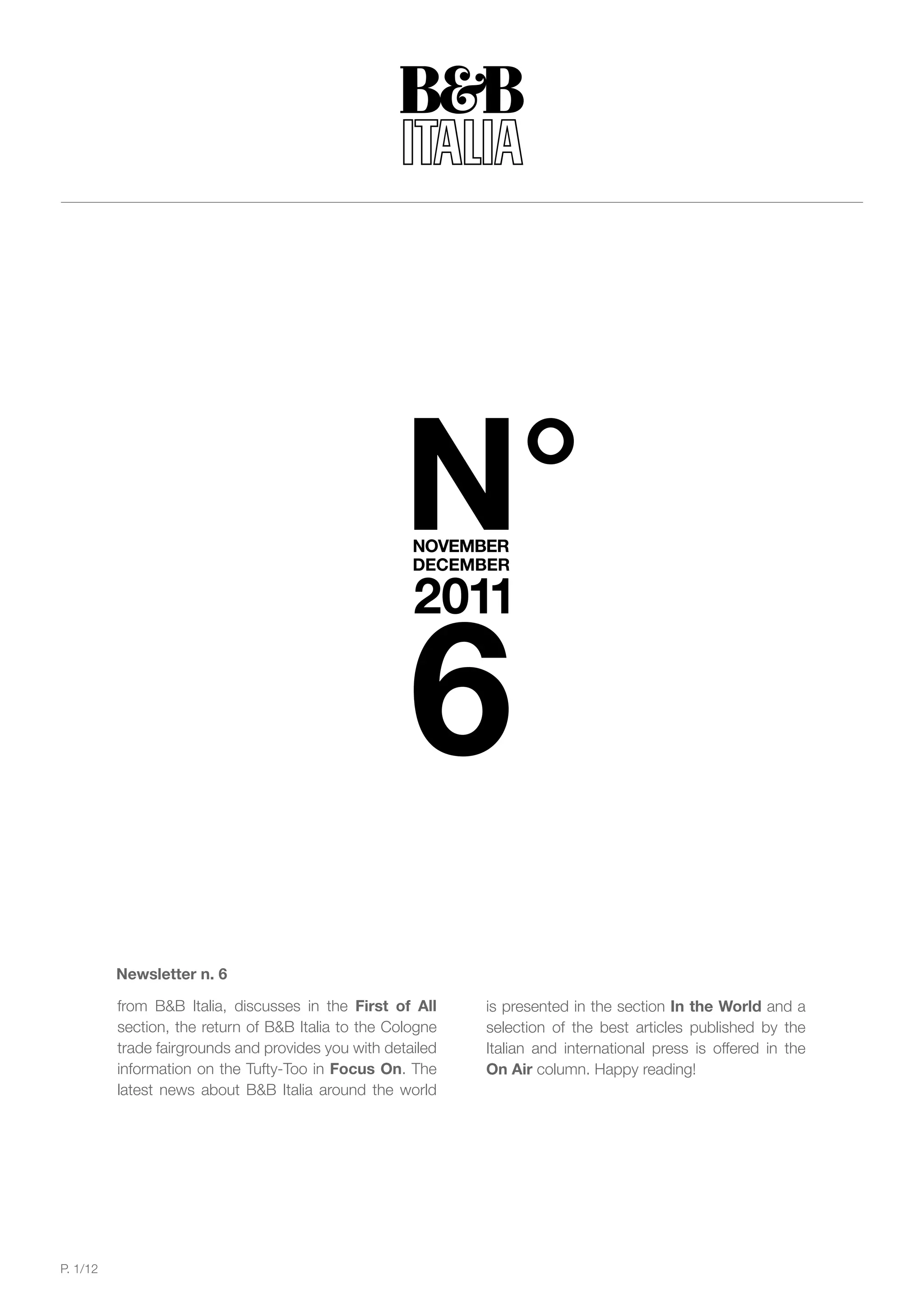 The document summarizes news from B&B Italia's November-December 2011 newsletter. It discusses B&B Italia's return to the Cologne trade fair with new products for 2012 on display. It provides details on Patricia Urquiola's Tufty-Too seating system which revisits 1960s-1970s styles with a contemporary look. It also briefly mentions some events B&B Italia supported, including exhibits in Milan and Turin showcasing B&B Italia furnishings.