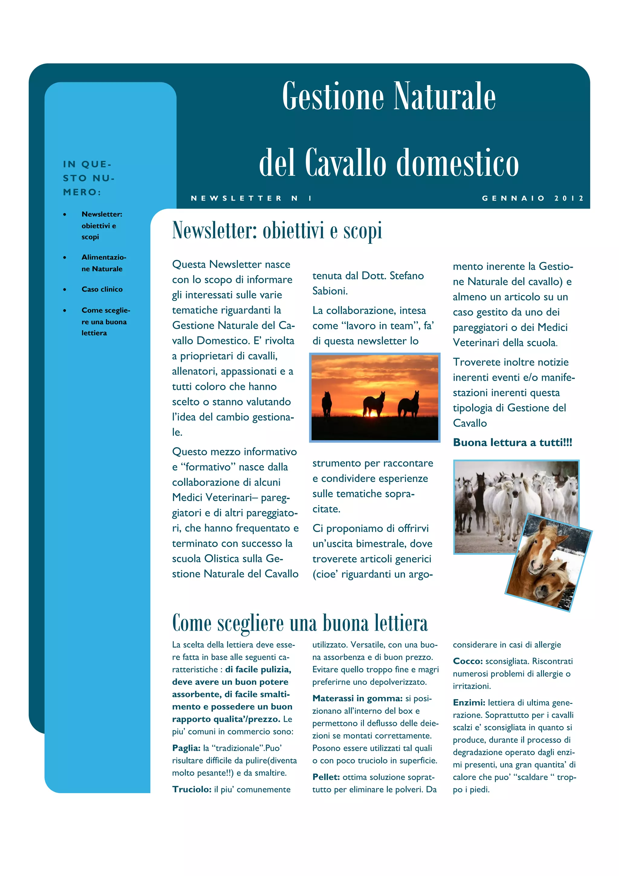 La newsletter si occupa della gestione naturale del cavallo domestico, fornendo informazioni su alimentazione, gestione del pascolo e scelta della lettiera. Essa è rivolta a proprietari, allenatori e appassionati, con articoli scritti da professionisti del settore. È prevista una bimestrale pubblicazione con approfondimenti su vari aspetti della cura e gestione del cavallo.