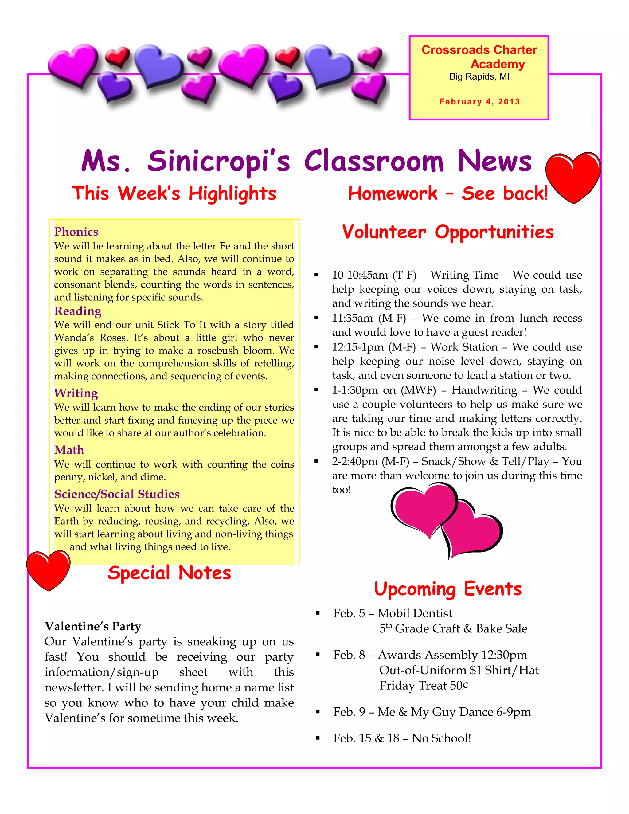 This classroom newsletter from Ms. Sinicropi provides information about the upcoming week's lessons and activities for her students. The newsletter also lists various volunteer opportunities in the classroom from 10 AM to 2:40 PM each day, including helping with writing time, reading to students, assisting at work stations, and more. It notes some upcoming events like a Valentine's party and a Me and My Guy dance. Homework involves completing a BINGO board of repetitive skills like phonics and math.