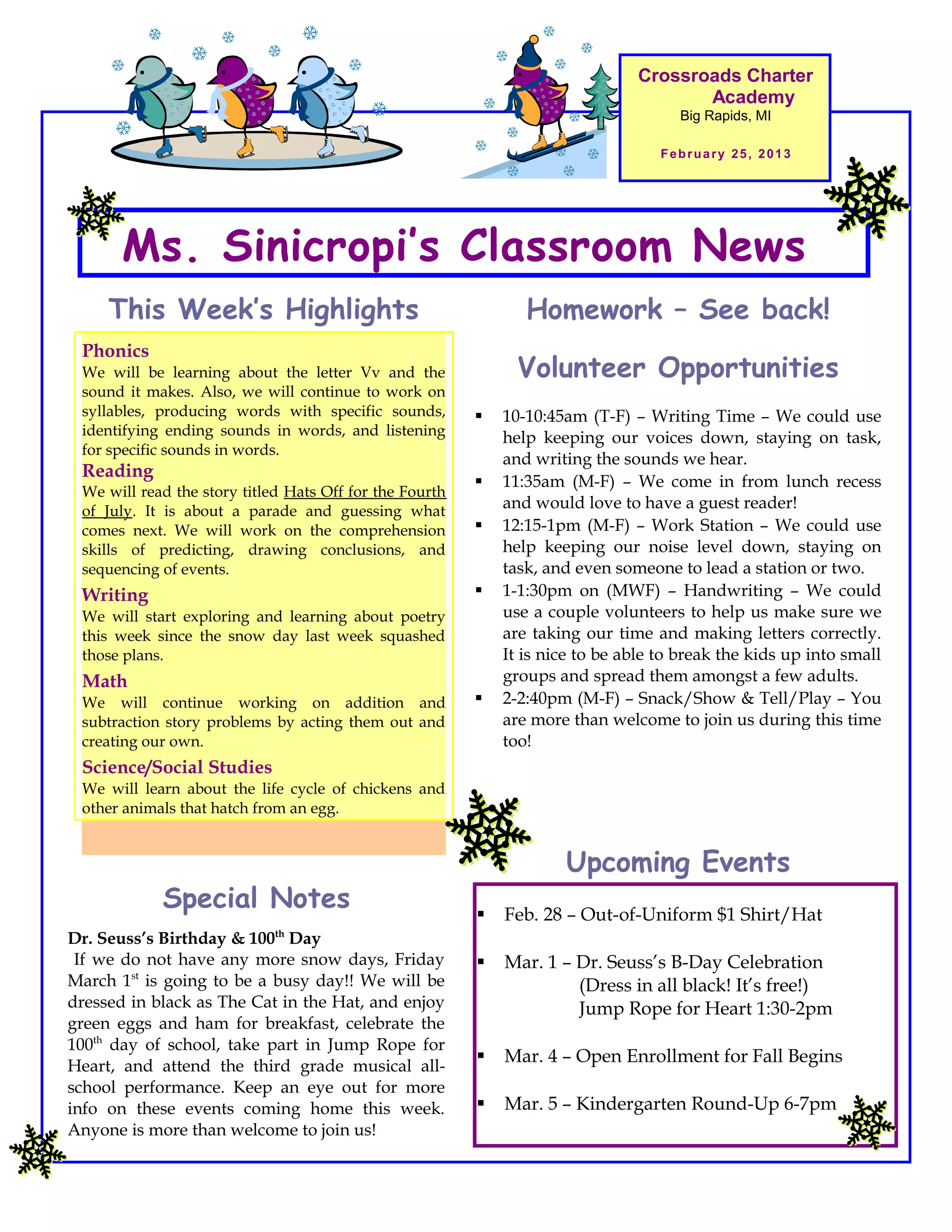 Ms. Sinicropi's kindergarten class at Crossroads Charter Academy is learning about the letter V and syllables in phonics. In reading, they will read a story about a parade and make predictions. Writing will focus on poetry. Math lessons involve addition and subtraction word problems. Science covers the life cycle of chickens. The class seeks volunteers for various activities and Dr. Seuss's birthday will be celebrated on March 1st with a musical performance. Homework involves a bingo board to practice skills.