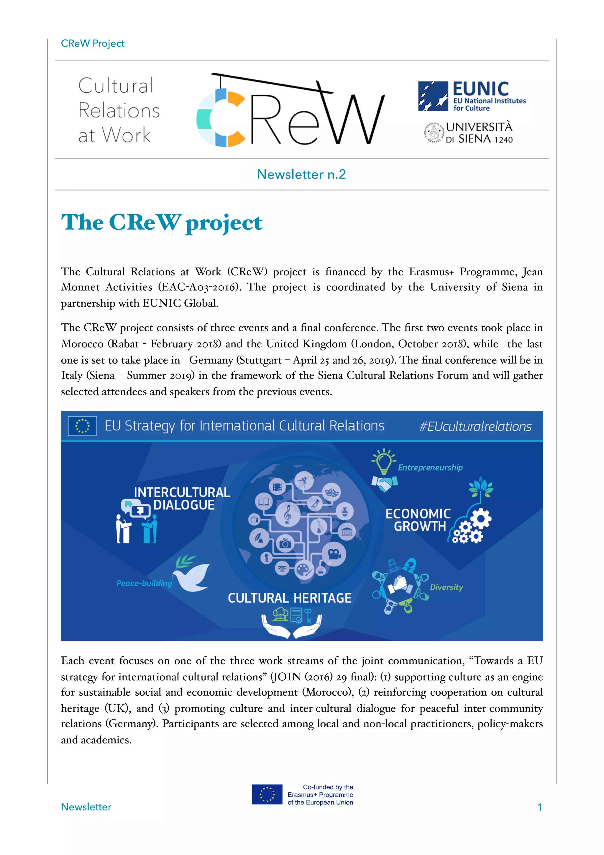 The CReW project consists of three events and a final conference focused on international cultural relations. The events took place in Morocco, the UK, and Germany, and addressed supporting culture for development, cultural heritage cooperation, and intercultural dialogue, respectively. The final conference will be in Italy. The project aims to foster dialogue between academics and policymakers, cross-fertilize research and practice, improve professional training, and facilitate access to knowledge on cultural relations. It encourages combining practical and theoretical approaches through case study analysis to create common understanding and applicable knowledge.