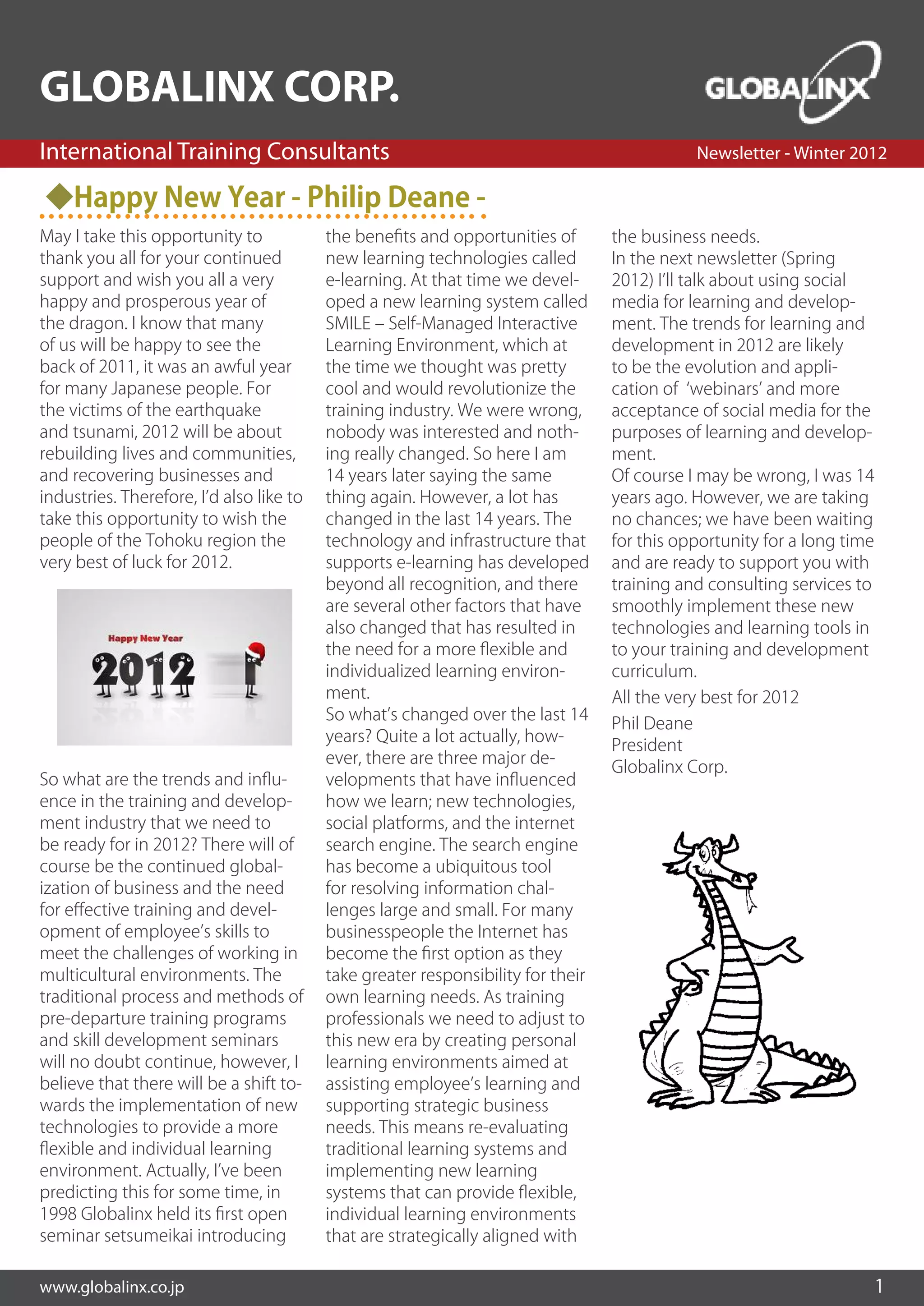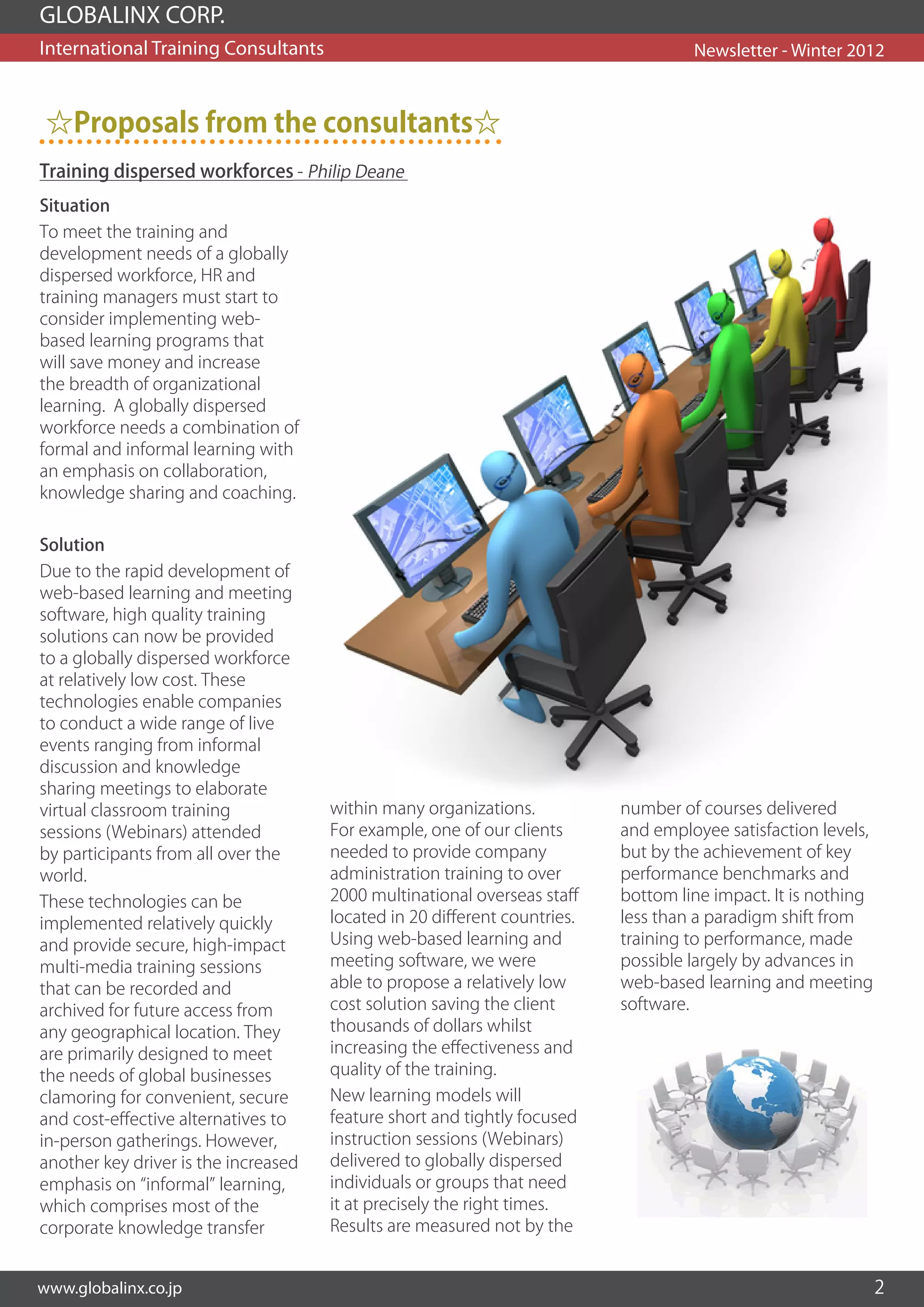 The newsletter discusses trends in training and development for 2012. It predicts increased use of e-learning technologies like webinars and social media. New learning systems need to provide flexible, individualized environments aligned with business needs. The consultants propose solutions for training dispersed workforces using web-based learning programs, and assessing organizational readiness for globalization through strategic alignment and defining new competency requirements.