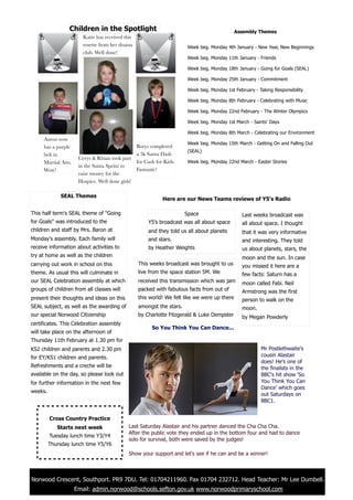 This document is a school newsletter from Norwood Primary School dated January 25th, 2010. It contains information about term dates and events, highlights of students, and announcements. It provides details on upcoming parents' evenings, assembly themes, a SEAL theme on goals, and notices about lost property and cross country practice starting. It also profiles a relative of a teacher appearing on a dancing competition show.