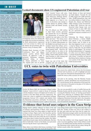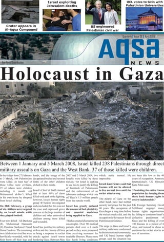 The document summarizes events related to the Israeli-Palestinian conflict from February to March 2008. It reports that 106 Palestinians were killed by Israeli forces in Gaza over 6 days, including 25 children. It also describes Israeli missile strikes targeting Palestinian children and the denial of medical care to Palestinians by Israeli authorities. The document discusses evidence that the US engineered violence between Fatah and Hamas factions in Gaza and leaked documents revealing this. It provides other brief updates on related political and human rights issues.