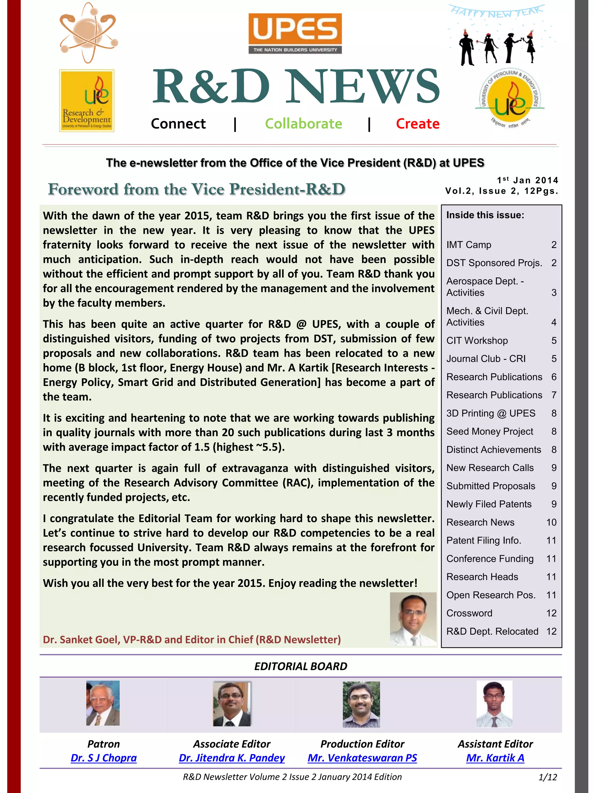 This newsletter summarizes research and development activities at UPES for the past quarter. Key highlights include: