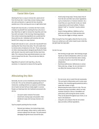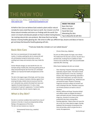 The document is a newsletter from Nafrini Skin Care that provides tips and advice for basic skin care, facial skin care, alleviating dry skin, and achieving beautiful soft skin. It discusses skin types, cleansing routines, moisturizing, exfoliating, and other lifestyle habits to maintain healthy skin. The newsletter also invites readers to submit article ideas or advertise their businesses within future issues.