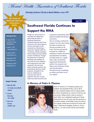 The Mental Health Association of Southwest Florida provides mental health services and programs throughout the region. For over 55 years, it has educated the community on mental wellness through various initiatives and community partnerships. Despite economic challenges, the organization has been able to fully fund its programs and services this year through community support and a small, multi-talented staff. It looks to continue innovative programming that educates through entertainment. The obituary section remembers Pedro A. Placeres, a devoted family man and dedicated employee.