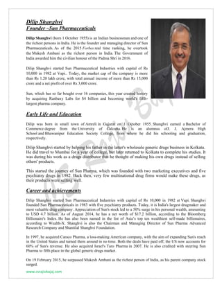 The document summarizes information about Dilip Shanghvi, the founder and managing director of Sun Pharmaceuticals. It states that he started Sun Pharma in 1982 with just Rs. 10,000 capital and it has now grown to a market cap of over Rs. 1.2 lakh crore. It also mentions that he created history by acquiring Ranbaxy Labs for $4 billion, making Sun Pharma the fifth largest pharma company in the world. The summary provides background on Shanghvi, including that he was born in Gujarat, earned a commerce degree, and started his career helping his father's drug business, which inspired him to start his own drug company.