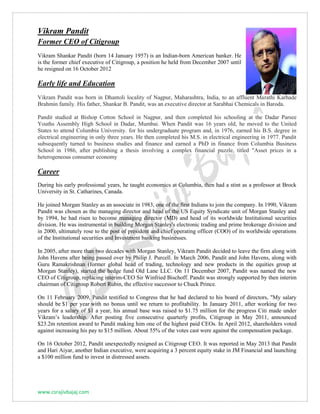 Vikram Pandit is an Indian-American former banker who served as CEO of Citigroup from 2007 to 2012. He earned degrees from Columbia University in electrical engineering and later a PhD in finance from Columbia Business School. Pandit had a long career at Morgan Stanley, rising to president and COO, before co-founding a hedge fund and then being named CEO of Citigroup in 2007. As Citigroup CEO, Pandit worked for $1 per year salary until the company returned to profitability and helped lead its recovery in the aftermath of the financial crisis, though he resigned unexpectedly in 2012.