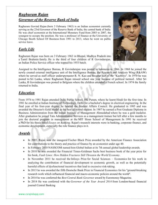 Raghuram Rajan is the current Governor of the Reserve Bank of India. He previously served as the chief economist of the International Monetary Fund from 2003 to 2007. Rajan received his PhD in management from MIT Sloan School of Management in 1991. He has received several awards for his research and contributions to economics and central banking, including being named the Best Central Bank Governor by Euromoney magazine in 2014.