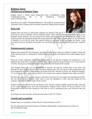 Kalpana Saroj is a female Indian entrepreneur who overcame immense hardship and discrimination to become a successful businesswoman. She took over distressed steel tube company Kamani Tubes, which had been shut down for 17 years, and successfully restructured it, paying off debts and reopening the factory. Through her entrepreneurial skills in real estate and other businesses, she built personal assets of over $112 million. Saroj works actively for disadvantaged groups and was awarded the Padma Shri in 2013 for her contributions to trade and industry.
