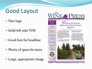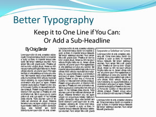 The document outlines basic principles for newsletter design including consistency, the use of appropriate design tools, and understanding fundamentals like color, layout, and typography. It discusses the pros and cons of hiring a designer versus designing in-house. Additionally, it emphasizes the importance of knowing the audience to create effective layouts for both print and web.