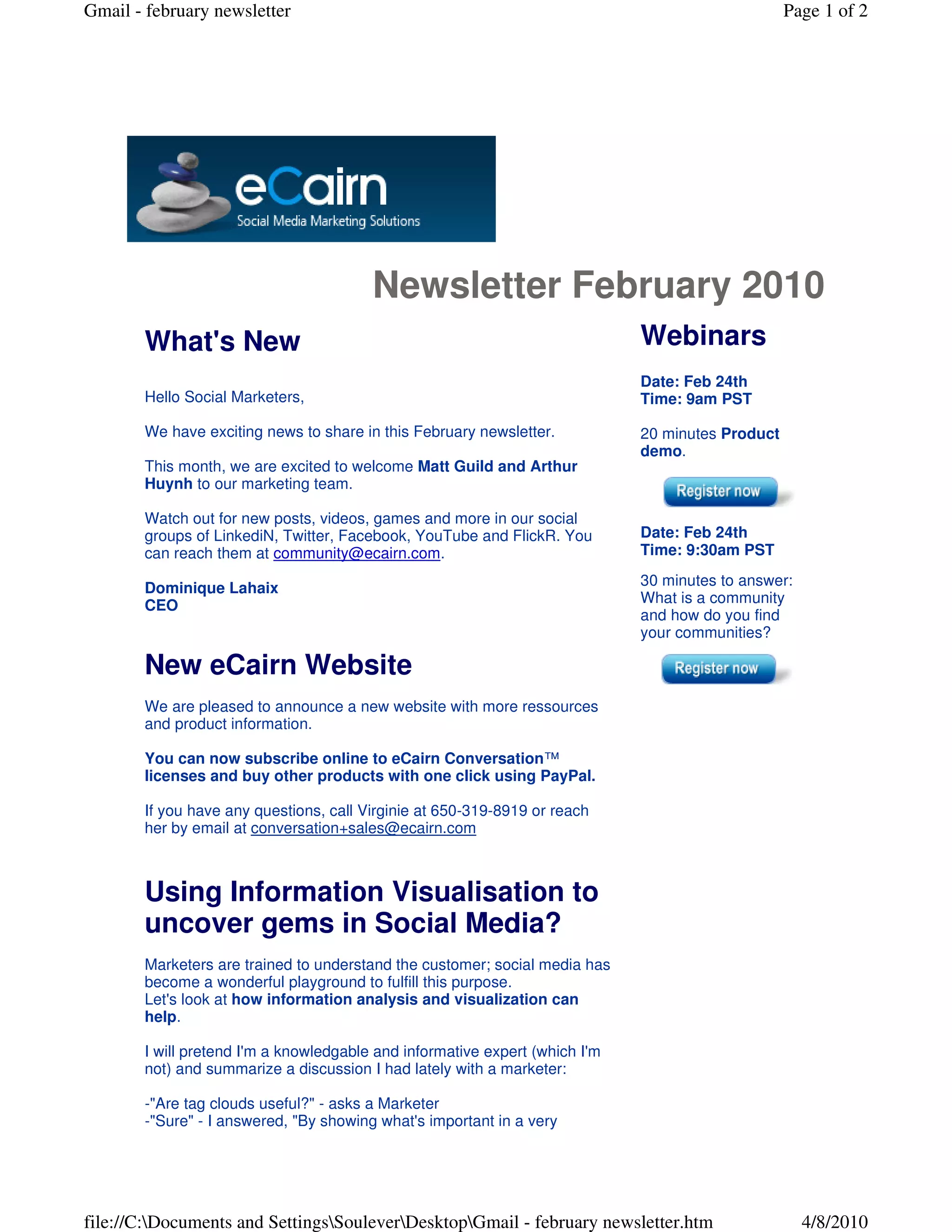 The document announces new additions to eCairn's marketing team and website. It discusses using information visualization and expression clouds to uncover insights from social media by identifying patterns of meaningful words. Finally, it promotes eCairn Conversation software and upcoming webinars on community building and product demonstrations.