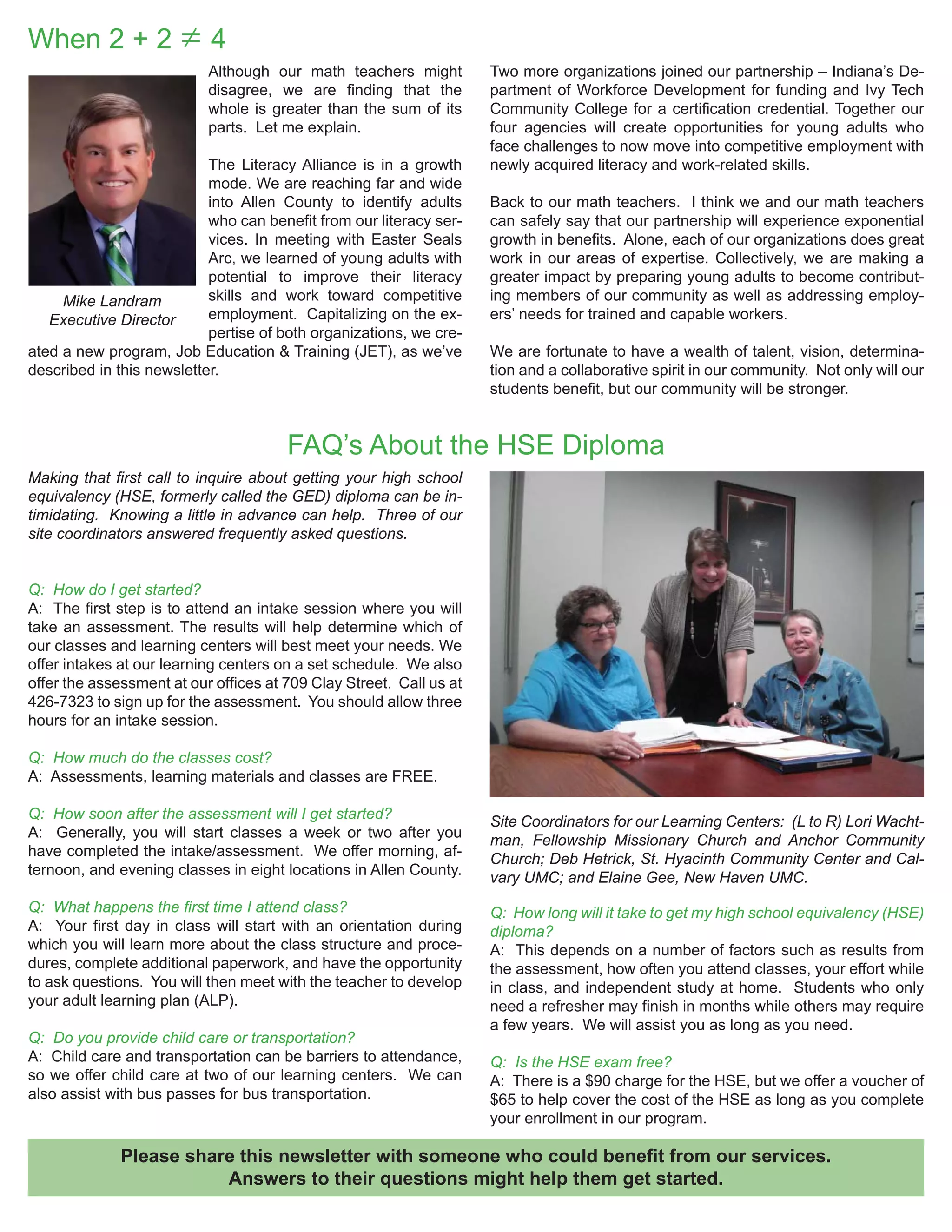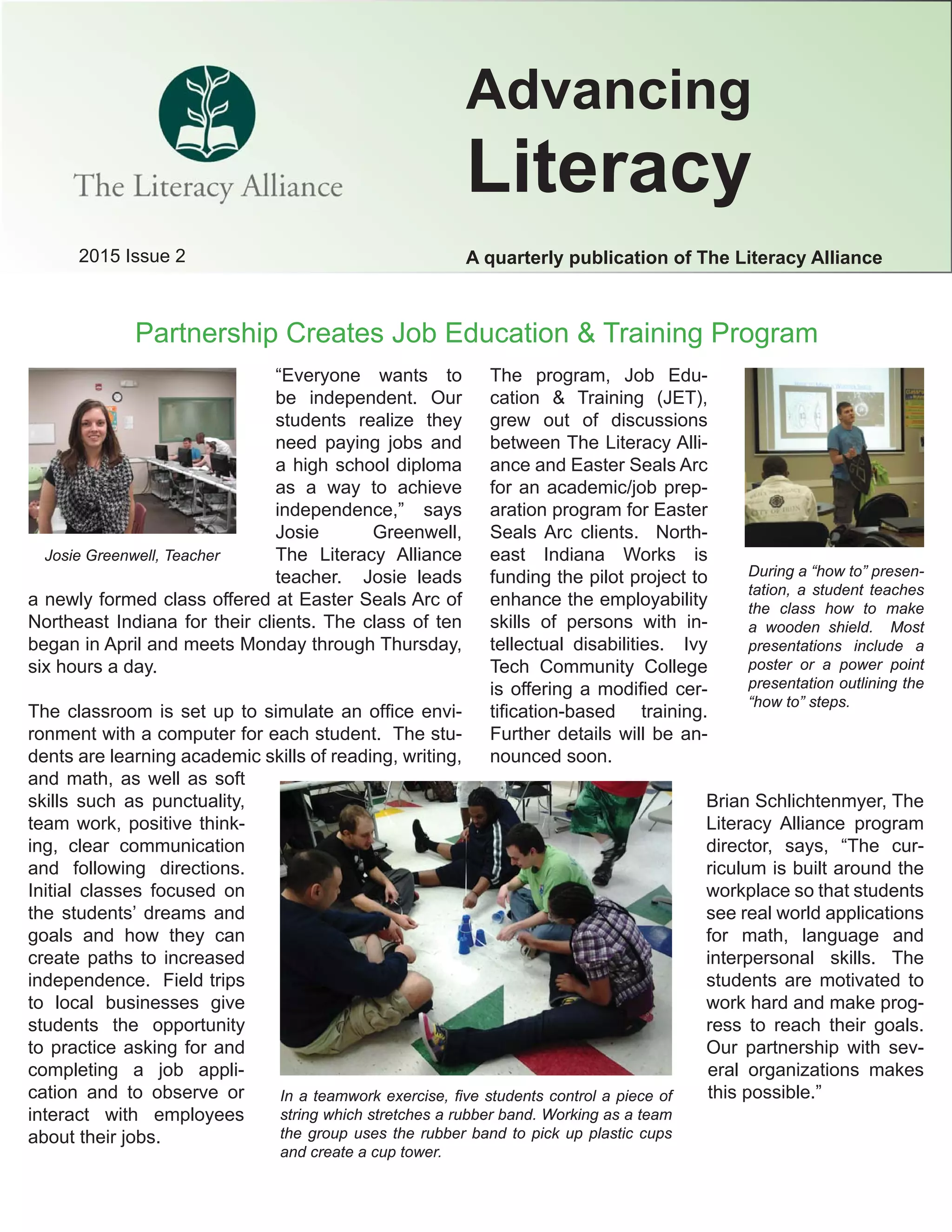 The Literacy Alliance has partnered with Easter Seals Arc and two other organizations to create a new Job Education and Training program. The goal is to provide academic and job skills training to help Easter Seals Arc clients gain employment. Northeast Indiana Works is funding the pilot program, and Ivy Tech Community College is providing a modified certification course. The program includes classroom instruction in reading, writing, math, and soft skills, as well as field trips to local businesses. Students are making progress toward their goals of independence and employment.