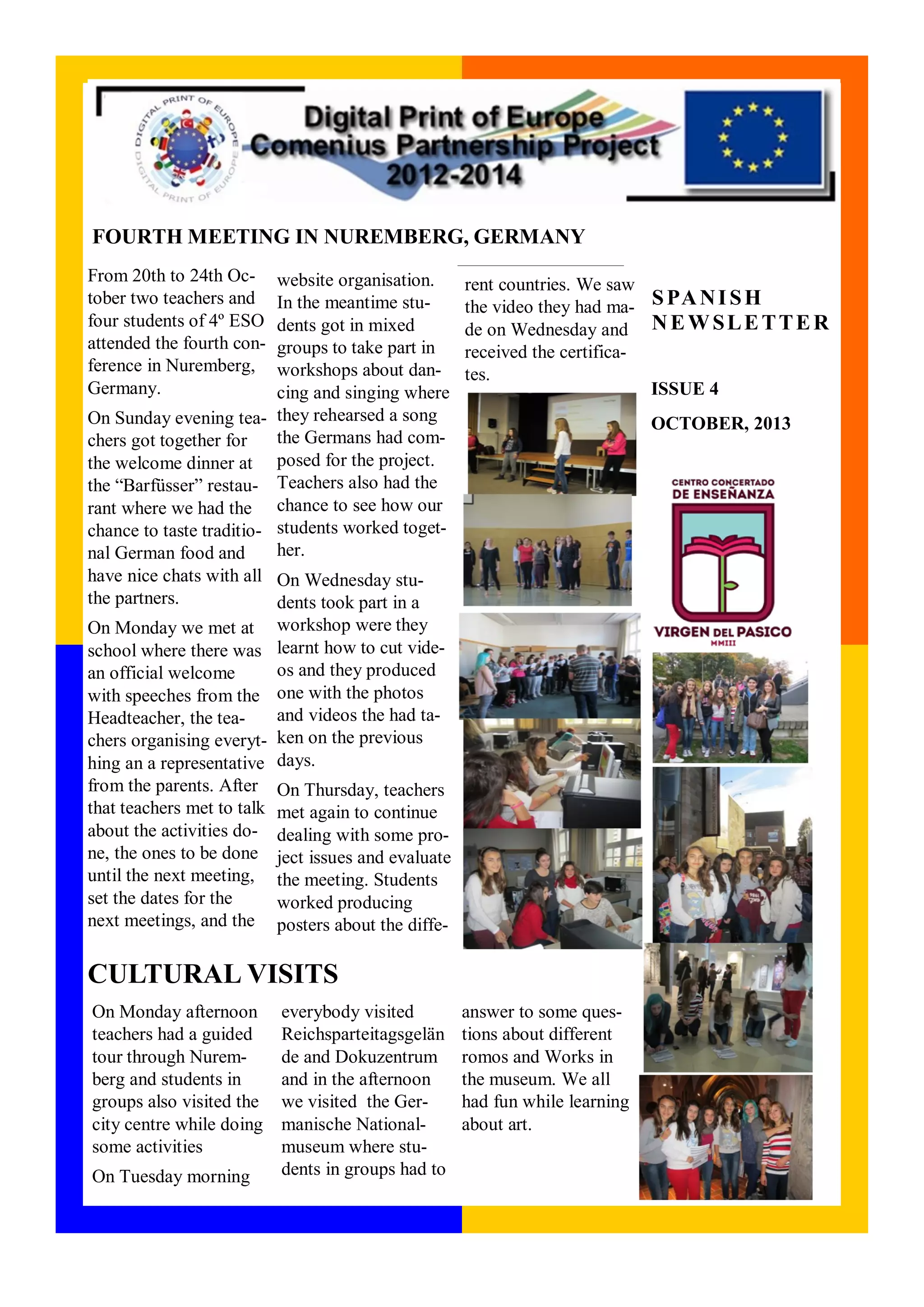From October 20th to 24th, two teachers and four students from a Spanish high school attended the fourth conference in Nuremberg, Germany as part of an international student exchange program. During the conference, students participated in workshops on dancing, singing, video editing, and poster making about different countries. Teachers met to discuss project activities and evaluate the conference. Students and teachers also took cultural trips around Nuremberg and visited several museums to learn about German history and art.