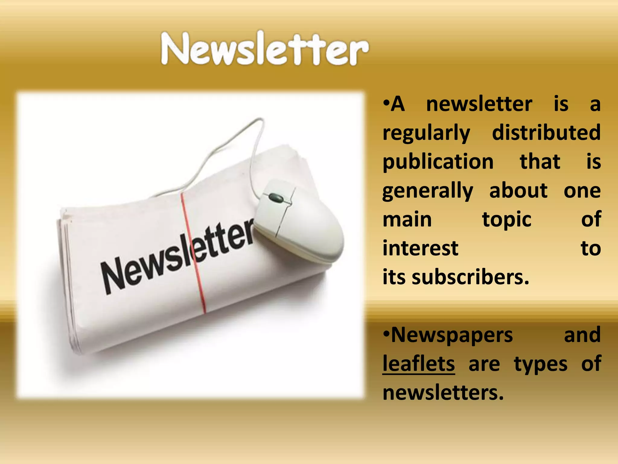 The document discusses different types of business communications including newsletters, reports, factsheets, press releases, and leaflets. It provides definitions and descriptions of each type of document, including their purpose, typical structure, and key elements. Guidelines are given for writing each type of document effectively, such as including an attention-grabbing headline, clear and concise paragraphs, and contact information.