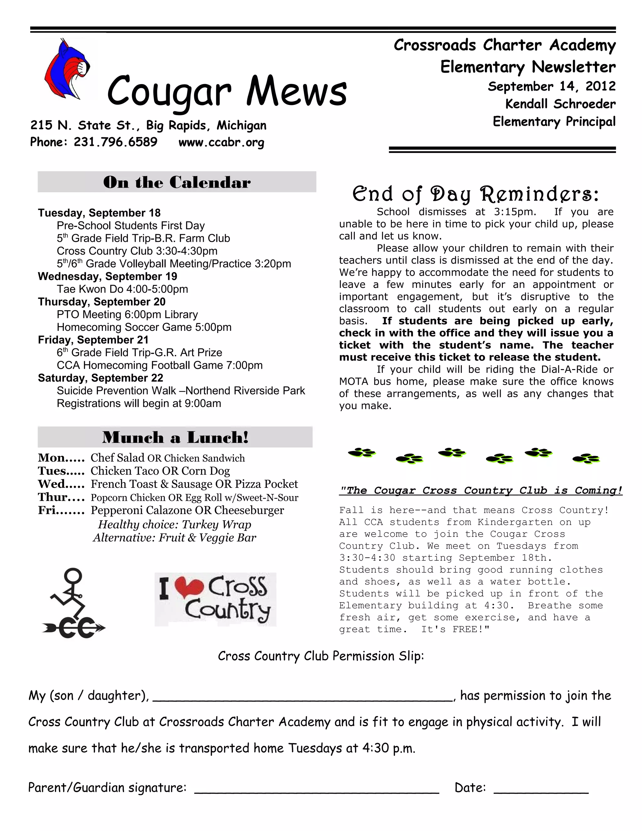 The newsletter provides information about upcoming events at Crossroads Charter Academy Elementary including field trips, sports activities, and meetings. It also includes reminders about school pick-up procedures, lunch menu, and requests for donations of items and box tops. The Cross Country Club is inviting new members and includes a permission slip. Immunizations are encouraged to avoid funding issues.
