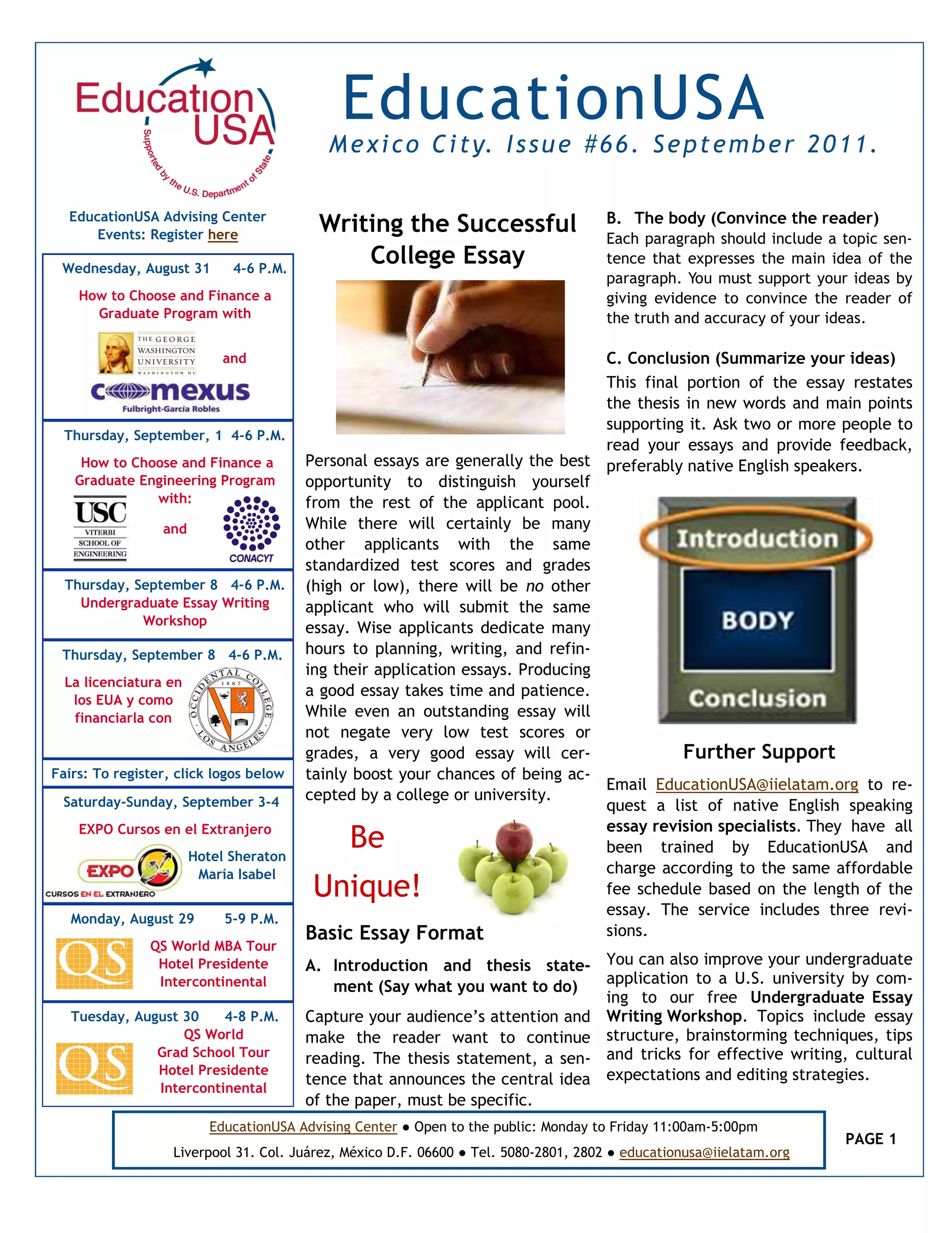 The document provides information on essay writing workshops and advising sessions aimed at helping students improve their college application essays in Mexico City. It also lists various scholarship opportunities for both undergraduate and graduate students, along with details on how to apply. Additionally, it promotes engagement through an alumni network and highlights upcoming events for individuals interested in U.S. education.