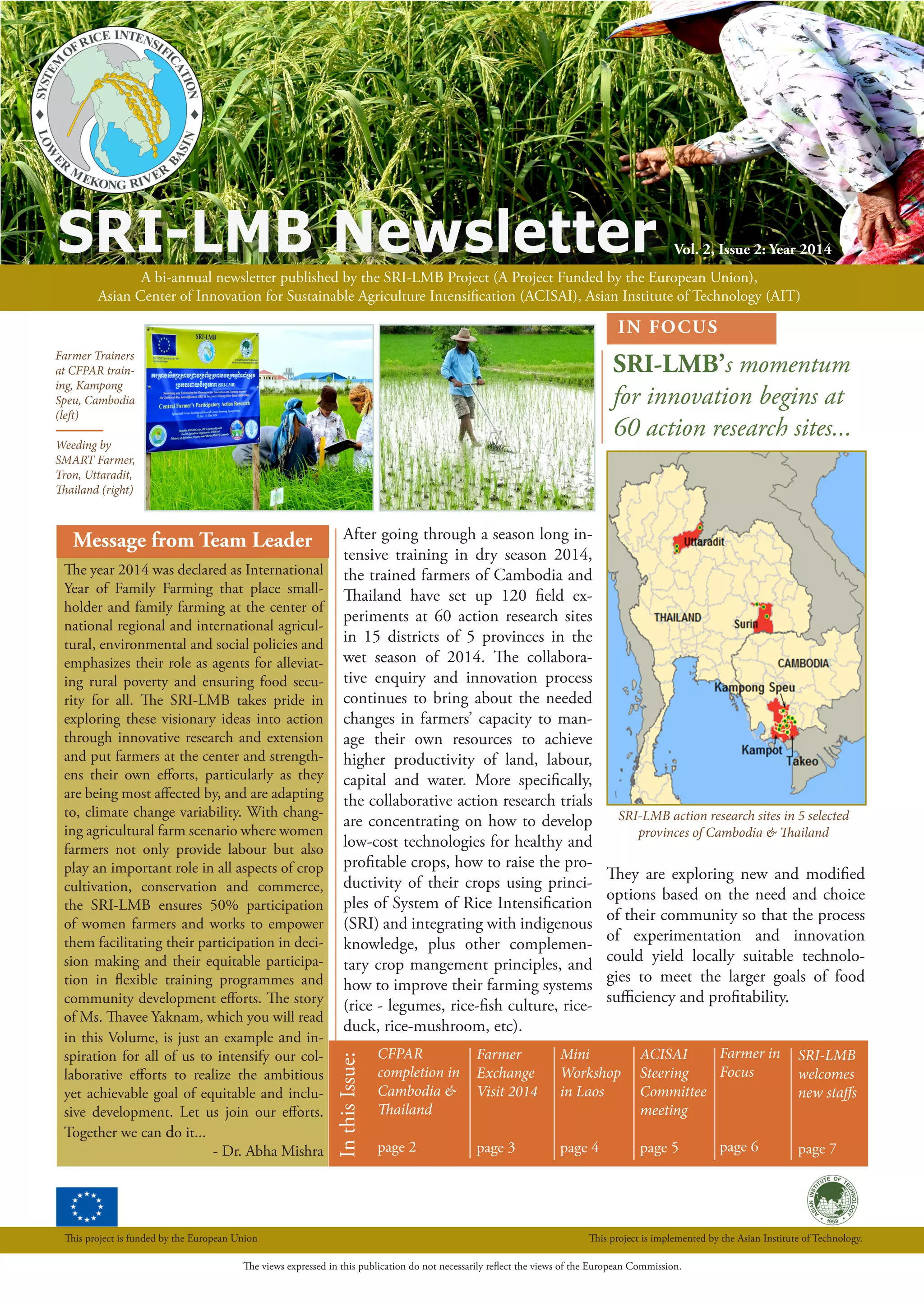 The Sri-LMB newsletter highlights the progress and activities of the Sri-LMB project focused on sustainable agriculture through the System of Rice Intensification (SRI) in Cambodia, Thailand, and Laos. It features training programs for farmer trainers, successful farmer experiments leading to increased productivity, and initiatives to empower women farmers amid climate change challenges. Additionally, the newsletter discusses workshops and collaborations aimed at promoting adaptive research and enhancing agricultural practices among smallholder farmers.