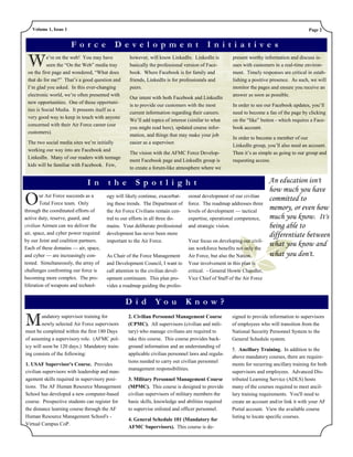 The newsletter highlights several online resources for Air Force supervisors, including the Supervisor Resource Center. The Supervisor Resource Center provides learning tools like courses, books, and job aids. It also includes a Leadership Knowledge Center with featured topics, courses, leadership challenges, and more. The newsletter also discusses the Education & Training Management System (ETMS Web), which allows supervisors, unit training managers, and training specialists to identify, approve, and track training requirements for employees. ETMS Web includes a course catalog and allows employees to view and submit training requests.