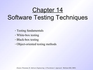 The document discusses various software testing techniques, including white-box testing and black-box testing. It provides details on characteristics of testable software, test characteristics, unit testing techniques like basis path testing and flow graph analysis, and methods for testing different types of loops and functions. The goal of the techniques is to design test cases that exercise all paths and conditions in the code to uncover errors.