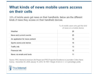 News is often a social activity where people enjoy discussing current events. With new technologies, people access news on multiple devices and platforms, rather than remaining loyal to one source. Mobile phones are now ubiquitous and can deliver news via SMS in real time, allowing users to be informed on the go. In India, where 65 crore mobile phones are in use mainly by young, educated users interested in value-added services, delivering concise news over SMS is an opportunity. Such "instant journalism" aims to inform with headlines and hard facts in a timely, objective, clear and simple manner using short, crisp sentences and abbreviations sent a few times per day. Future developments may include video news via MMS and streaming.