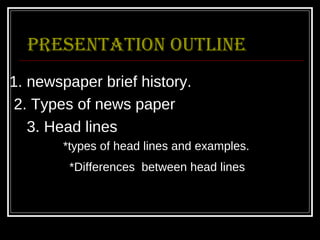 The document provides an overview of newspaper history and types of newspaper articles. It discusses how newspapers originated in ancient Rome and China and evolved with the printing press. The document outlines the differences between broadsheet and tabloid newspapers. It also describes various types of newspaper articles like news articles, features, editorials, columns, and interviews. Headlines and conclusions of news stories are also addressed.
