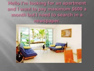 The document describes a person looking for a new apartment. They found a two-room, one-bathroom apartment with a small garage and kitchen/sitting room for a maximum of $600 per month. They like the new place but need money from their parents to buy furniture. They are happy with their new building that has an elevator and security, providing a quiet place to live. They look forward to seeing friends and family in their new neighborhood.