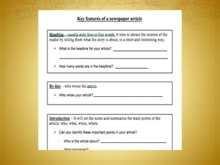 This document outlines 7 steps for writing a newspaper article: 1) Compile facts, 2) Write an attention-grabbing lead sentence, 3) Provide important details like who, what, when, where, 4) Include additional context, 5) Double check facts, 6) Remain unbiased, 7) Conclude with a restatement or future outlook. It emphasizes planning before writing, using a clear lead, and accurately reporting verified facts in an objective tone. Key elements like a headline, byline, introduction, body, and image caption are also noted. Following these steps is intended to help the student write a well-structured newspaper article.