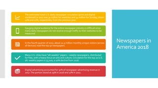Newspaper circulation, readership, and revenue have been declining over the past decade as more people get their news from digital and social media sources. Total daily newspaper circulation in the US was estimated at 31 million in 2017, down 11% from the previous year. The number of newspaper employees also dropped significantly from over 70,000 in 2008 to around 39,000 in 2017. While newspapers have struggled, some including USA Today and large digital newspapers have maintained readership in the millions by adapting to changing media consumption habits.