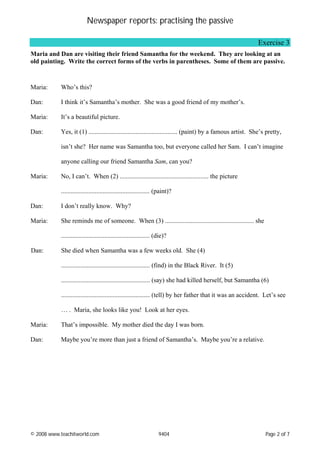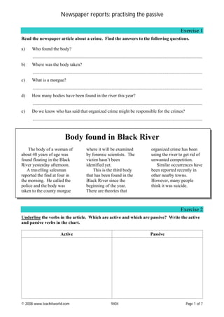 The document provides exercises for students to practice identifying and using active and passive verbs in the context of a newspaper article about a body being found in a river. Students are tasked with answering comprehension questions about the article, underlining the verbs and identifying them as active or passive, completing sentences using the correct verb form and tense, rewriting sentences from a sample news article in the passive form, and conducting an interview with a witness to a bank robbery and writing a news article based on the interview.