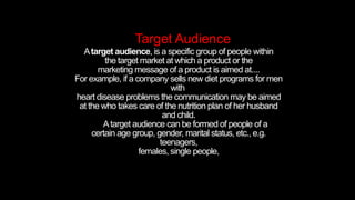 The document discusses identifying a newspaper's target audience. It explains that the target audience can be identified using the "RIVALING" technique, which considers representation, institution, values, audience, language, ideology, narrative, and genre. The document then analyzes each of these factors. It concludes that based on demographics and a goal of reviving print media among youth, the target audience for the author's newspaper will be people aged 18 and older.