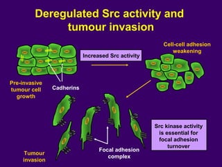 The document discusses several approaches for controlling cell growth and tumor progression, including targeting key molecular pathways, blocking angiogenesis through anti-angiogenic therapies, and using gene therapy to supply healthy genes. It also outlines how increased understanding of biological processes in tumors and the body's response has enabled molecular targeting of specific proteins and pathways involved in tumor growth, invasion, and metastasis. Promising targets mentioned include EGFR, angiogenesis factors, and the tumor vasculature.