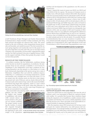 This document summarizes the results of a 3-year project to help amphibians safely cross a bicycle path during their spring migration in Leeuwarden, Netherlands. In the third year, over 1,000 amphibians were recorded crossing, with increased numbers of common newts, common toads, and common frogs compared to previous years. The project utilized drift fences and pitfall traps along the path and involved local volunteers, students, and education activities to teach the public about the importance of the amphibian migration. The organizers hope to continue the project for many more years.