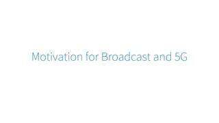 The document discusses the potential for 5G and broadcast technologies to work together. It provides background on past attempts at broadcast to handhelds that failed and lessons learned. 5G technologies like FeMBMS/enTV broadcast mode and network slicing could enable improved broadcast to mobile/indoor receivers. The DVB is analyzing scenarios for using 5G networks to distribute DVB services or enhance DVB services with 5G capabilities. Ongoing work includes defining collaboration between DVB providers and 5G operators.