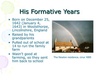 Isaac Newton was an English scientist known for his laws of motion and universal gravitation (1642-1727). He formulated calculus, proved that white light is composed of the visible spectrum, and showed that the force of gravity follows an inverse-square law. Newton published his findings, including his laws of motion, after being inspired by an apple falling from a tree and realizing that the same force caused objects to fall on Earth and the moon to orbit.