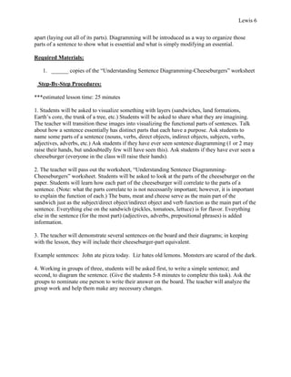 This lesson introduces students to sentence diagramming by using an analogy to diagramming a cheeseburger. Students will learn the parts of a sentence and how they function by comparing them to the components of a cheeseburger sandwich. They will practice diagramming sentences in groups and individually. For homework, students will diagram three sentences of their own.