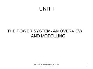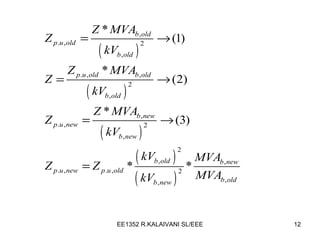 The document provides an overview of power system analysis and modeling. It discusses modeling of various power system components like generators, transformers, transmission lines, and induction motors using equivalent circuits. It also covers per unit calculations and formation of impedance and reactance diagrams from a single line diagram. The document further discusses power flow analysis using bus admittance matrix and different iterative methods. It covers balanced and unbalanced fault analysis using symmetrical components. It concludes with discussing power system stability including steady state, transient, and voltage stability.