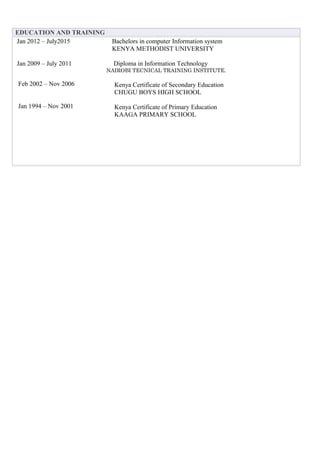The document is a curriculum vitae for Ntara Newton Murugu. It summarizes his personal details, education history, work experience, skills, and references. He has a bachelor's degree in computer information systems from Kenya Methodist University and is currently working in the Domestic Tax Department at the Kenya Revenue Authority, where he is responsible for collecting landlord and tenant certificates of compliance. His objective is to find a challenging position that utilizes his skills and abilities, and allows him to work diligently while upholding professional ethics.